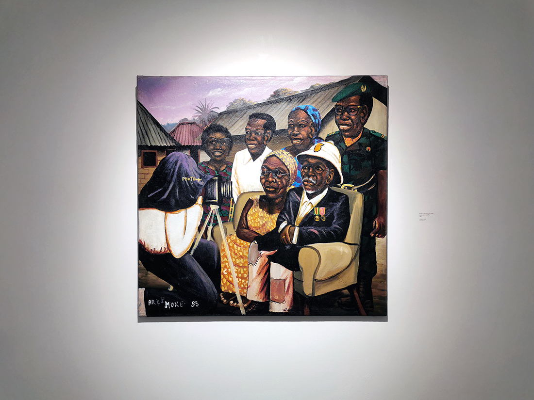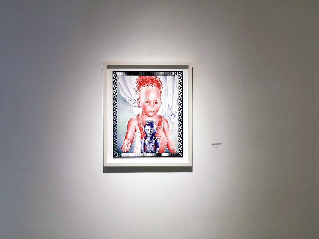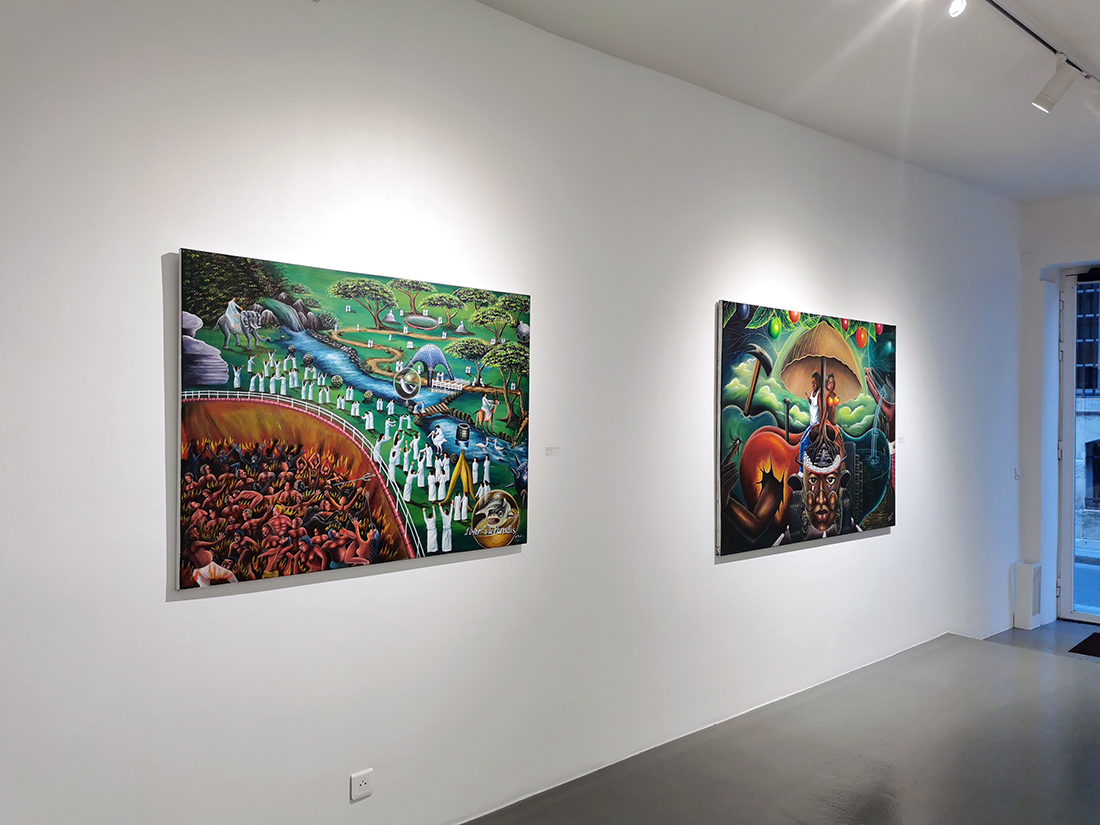 The Bodo siblings are two sons with contrasting career paths: the eldest, Bodo fils (1974), directly utilises the dazzling surrealism of his father, Pierre Bodo (1953-2015), while the youngest, Amani Bodo (1988), has a more narrative approach, particularly focusing on Africa’s and DR Congo’s place in the world. His work Héritage Bodo depicts him in front of one of the creatures that populate his father’s paintings.