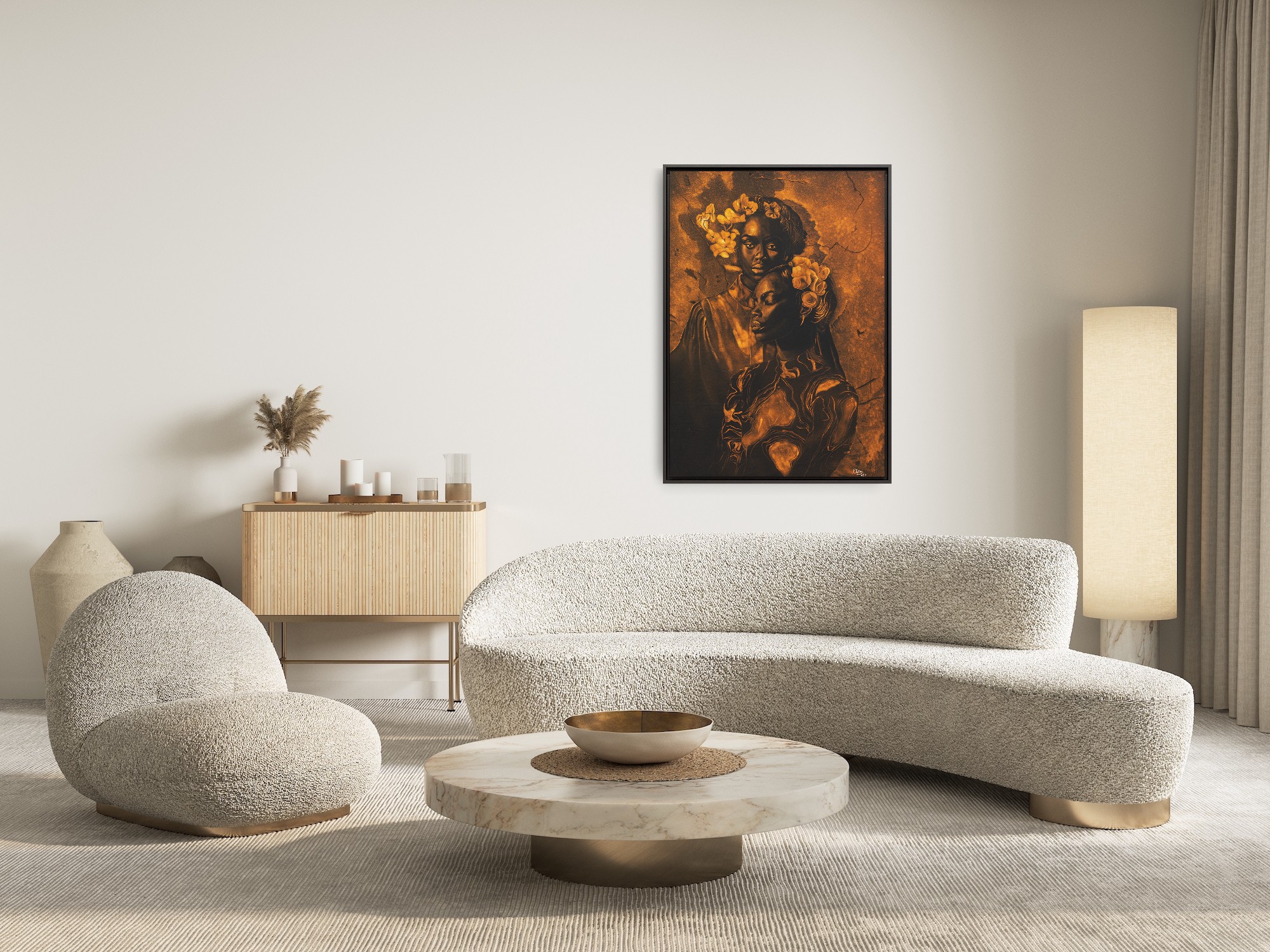 Eau de Javel sur tissu 103 x 73 cm Cadre de bois noir Disponible Quand l’introspection et l’histoire personnelle se rejoignent dans une poétique visuelle marquée par la nostalgie et la résilience.